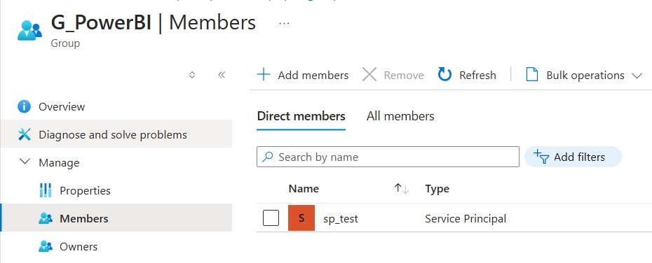 2: 在Azure -> Microsoft Entra ID -> Group -> 新建Security Group,并把第一步的sp_test添加进Members里