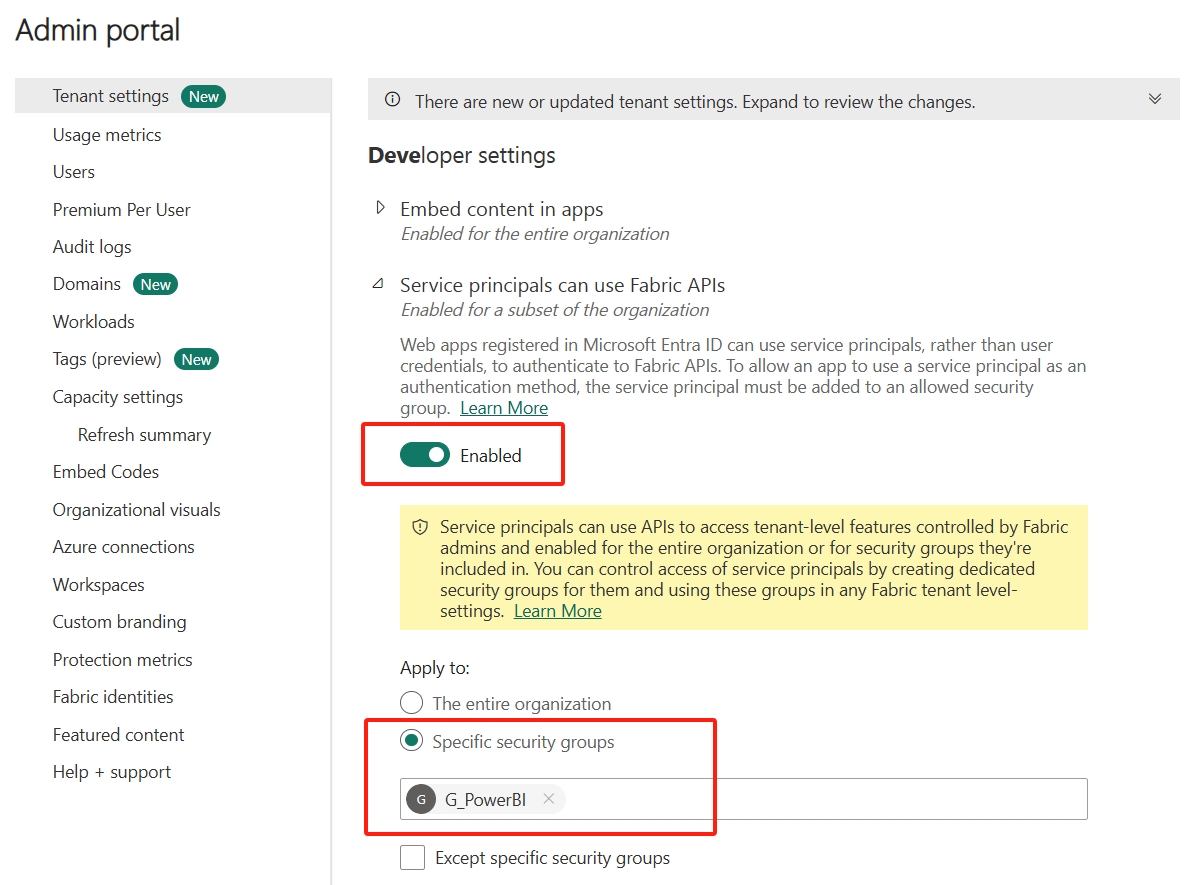 3:进入Power BI -> Admin Portal -> Tenant settings 设置允许Service principals can use APIs,并Apply第二步的Group